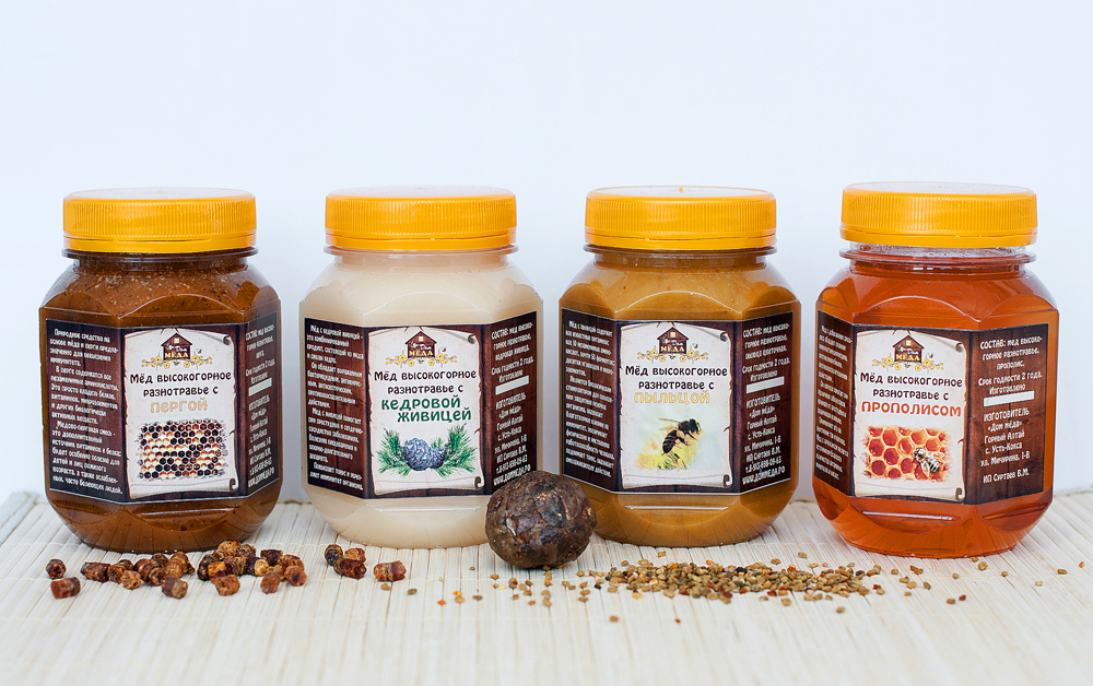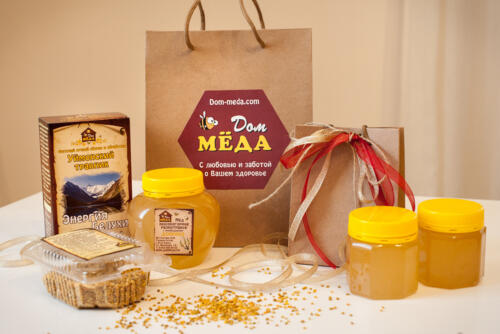Здесь вы найдете огромный выбор различных сортов меда, таких как: мед разнотравье с преобладанием акации, клевера, эспарцета, белковки, яблоневого цвета, малины, высокогорное разнотравье «Альпийские луга», «Таежное разнотравье». В магазине представлены уникальные медовые композиции: мед с прополисом «Волшебный дар пчелы», мед с пыльцой «Гармония природы», мед с пергой, мед с кедровой живицей.
